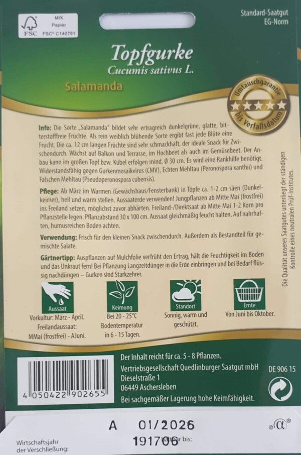 Info: Die Sorte „Salamanda“ bildet sehr ertragreich dunkelgrüne, glatte, bitterstofffreie Früchte. Als rein weiblich blühende Sorte ergibt fast jede Blüte eine Frucht. Die ca. 12 cm langen Früchte sind sehr schmackhaft, der ideale Snack für Zwischendurch. Wächst auf Balkon und Terrasse, im Hochbeet als auch im Gemüsebeet. Der Anbau kann im großen Topf bzw. Kübel erfolgen mind. Ø 30 cm. Es wird eine Rankhilfe benötigt. Widerstandsfähig gegen Gurkenmosaikvirus (CMV), Echten Mehltau (Peronospora xanthii) und Falschen Mehltau (Pseudoperonospora cubensis).