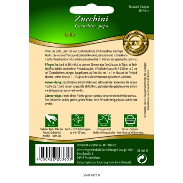 Info: Die Sorte „Leila“ ist eine Zucchinizüchtung mit kompakten, buschigen Wuchs. Die einzelne Pflanze produziert dunkelgrüne, glänzende und schmackhafte Früchte. Die robuste Sorte hat sich im Anbau bewährt, ist früh und ertragssicher bis zum Frost.