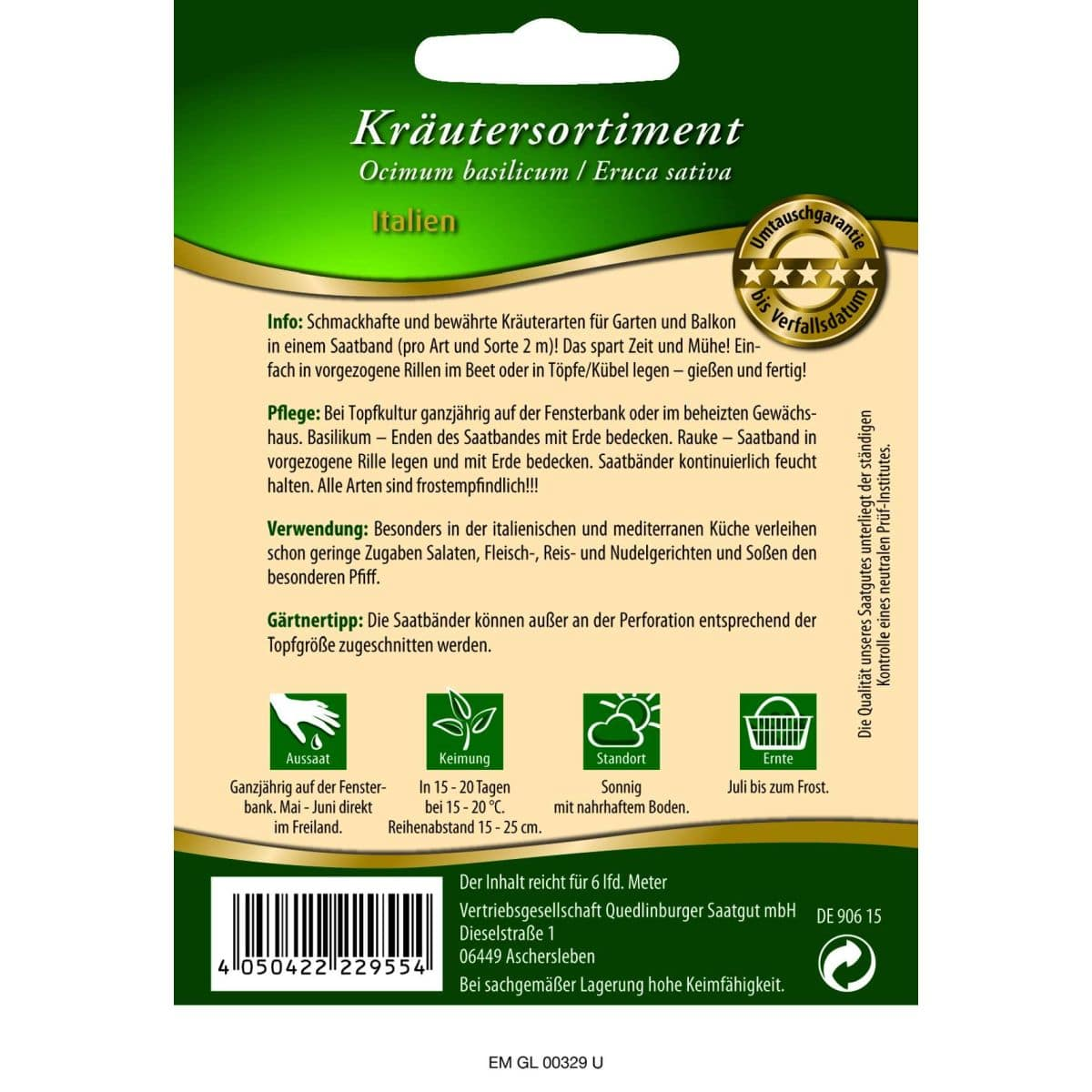 Pflege: Bei Topfkultur ganzjährig auf der Fensterbank oder im beheizten Gewächshaus. Basilikum – Enden des Saatbandes mit Erde bedecken. Rauke – Saatband in vorgezogene Rille legen und mit Erde bedecken. Saatbänder kontinuierlich feucht halten. Alle Arten sind frostempfindlich!!!