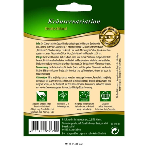 Info: Die Kräutervariation Deutschland enthält die gebräuchlichsten Gewürze wie Dill „Einfach“, Petersilie „Mooskrause 2“ (Standardsaatgut EG-Norm) und Schnittlauch „Middleman“ (Standardsaatgut EG-Norm). Eine ideale Mischung für Salate, Quark- und Eierspeisen u. v. mehr. Wuchshöhe Dill ca. 80 cm, Schnittlauch und Petersilie ca. 30 cm.