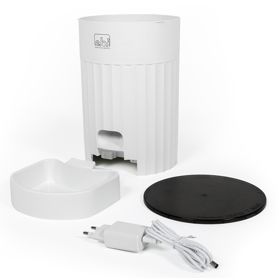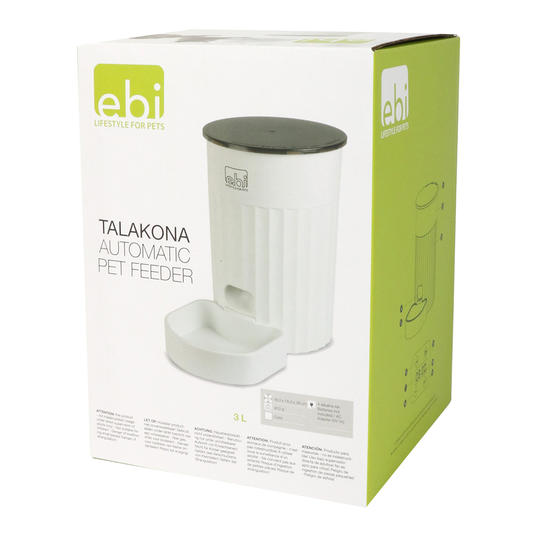Talakona von EBI ist ein programmierbares Fütterungssystem für Hunde und Katzen. Es ist ideal, wenn Sie unerwartet ein paar Stunden Überstunden machen müssen und Ihr Haustier daran gewöhnt ist, zu einer festen Zeit gefüttert zu werden. Talakona hat ein Fassungsvermögen von 3 Litern und arbeitet mit 20-Gramm-Portionen. Sie können bis zu 120 g pro Portion geben, Dosierung entsprechend Ihrem Tier. Stellen Sie ein, wie viele Portionen Ihr Haustier bekommt und zu welchen Zeiten. Sie können bis zu 4 Mal pro Tag einrichten. Füttern Sie gierigen Haustieren kleinere Futterportionen und verteilen Sie diese über den Tag. Kleinere Portionen helfen Ihrem Tier, sein Futter besser zu verdauen und die Energie aus dem Futter besser aufzunehmen. Talakona funktioniert über einen Adapter und Batterien (4x AA Alkali-Batterien + 5V Adapter). Sollte der Strom ausfallen, arbeitet das Fütterungssystem vorübergehend mit den Batterien weiter, so dass Sie sich keine Sorgen machen müssen, wenn der Strom ausfällt. Wegen des schnellen Verbrauchs wird die Verwendung nur mit Batterien nicht empfohlen. Talakona ist nur für Trockenfutter geeignet. Das Fütterungssystem selbst ist nicht spülmaschinenfest, sondern nur der herausnehmbare Futternapf. Der Deckel lässt sich durch ein Drehsystem sicher verschließen und kann somit nicht von Ihrem Haustier geöffnet werden. WARNUNG: Das Fütterungssystem ist nicht dafür gedacht, Ihr Haustier über längere Zeit allein zu lassen!