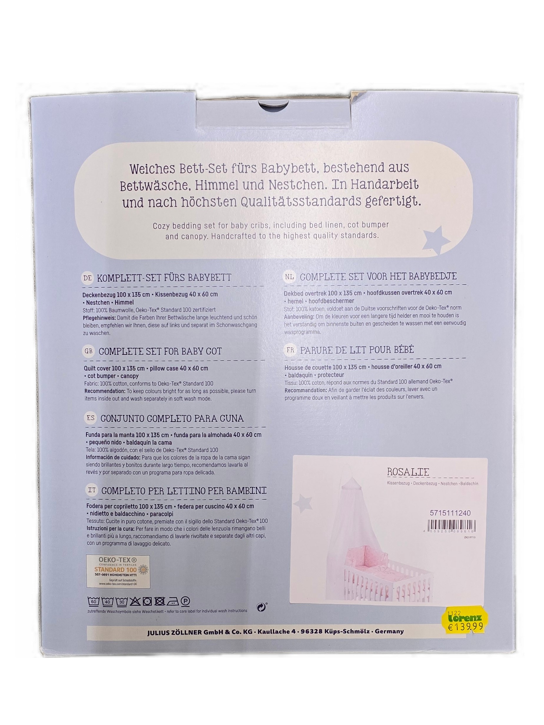 Das JULIUS ZÖLLNER Bett-Set Rosalie wurde mit viel Liebe zum Detail gefertigt, um den höchsten Ansprüchen an Qualität und Komfort gerecht zu werden. Die verwendeten Materialien sind besonders hautfreundlich und atmungsaktiv, ideal für die zarte Babyhaut. Entdecken Sie die einzelnen Bestandteile dieses traumhaften Sets: