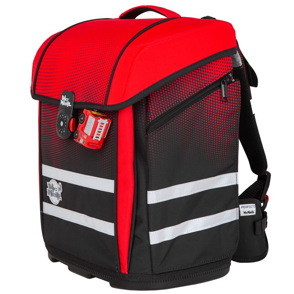 McNeill Schulranzen - Das ergonomische Rückenpolster, die gepolsterten Schulterriemen mit retroreflektierenden Streifen, der höhenverstellbare Brustgurt und ein abnehmbarer Beckengurt machen den Perfecto zu einem optimalen Ranzen. Der Schulranzen ist ausgestattet mit dem ClickFlex-Tragesystem mit 3-Punkt-Ergonomie für einen idealen Sitz. Das Rückenpolster schmiegt sich dabei der Kontur des Rückens an und die drei Auflageflächen gewährleisten einen festen und ergonomischen Sitz. Der Schulranzen lässt sich mit dem reflektierenden Einhandmagnetschloss kinderleicht öffnen. Das Hauptfach verfügt über eine praktische Innenaufteilung mit einem Bücherfach. Unter dem Deckel befindet sich der Stundenplan und ein Elastikband zur platzsparenden Aufbewahrung des Schüleretuis. An dem Deckel besitzt der Schulranzen einen gepolsterten Tragegriff. Zwei Vorfächer bieten zusätzlichen Stauraum. In den zwei großen Seitentaschen mit Reißverschluss lassen sich Regenschirm und Trinkflasche sicher verstauen. Ein Schlüsselband ist ebenfalls integriert. Der standfeste und wasserabweisende Boden bietet Schutz vor Nässe. Eine Vielzahl reflektierender Elemente bieten Ihrem Schulkind zusätzliche Sicherheit im Straßenverkehr.