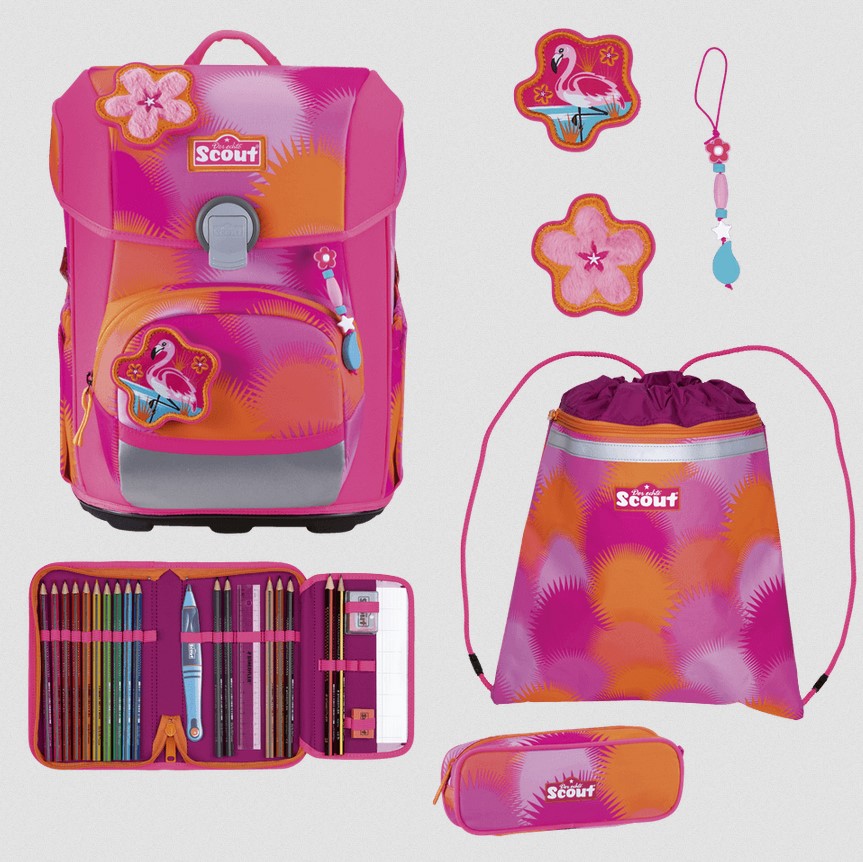 Bunt wie Konfetti: Mit unserem schlanken Schulranzen Scout Neo kommt Farbe in den Schultag. Er ist ergonomisch, hat einen festen Korpus und bietet beste Rundumsicht dank flachem Deckel. Zudem sorgt er mit retroreflektierenden und fluoreszierenden Flächen nach DIN 58124 für besonders gute Sichtbarkeit. Das Beste aber: Sportbeutel, Federmäppchen mit Staedtler Qualitätsbuntstiften, Schlamperetui, 2 Funny Snaps Move sowie 1 Blümchen-Anhänger sind inklusive.
