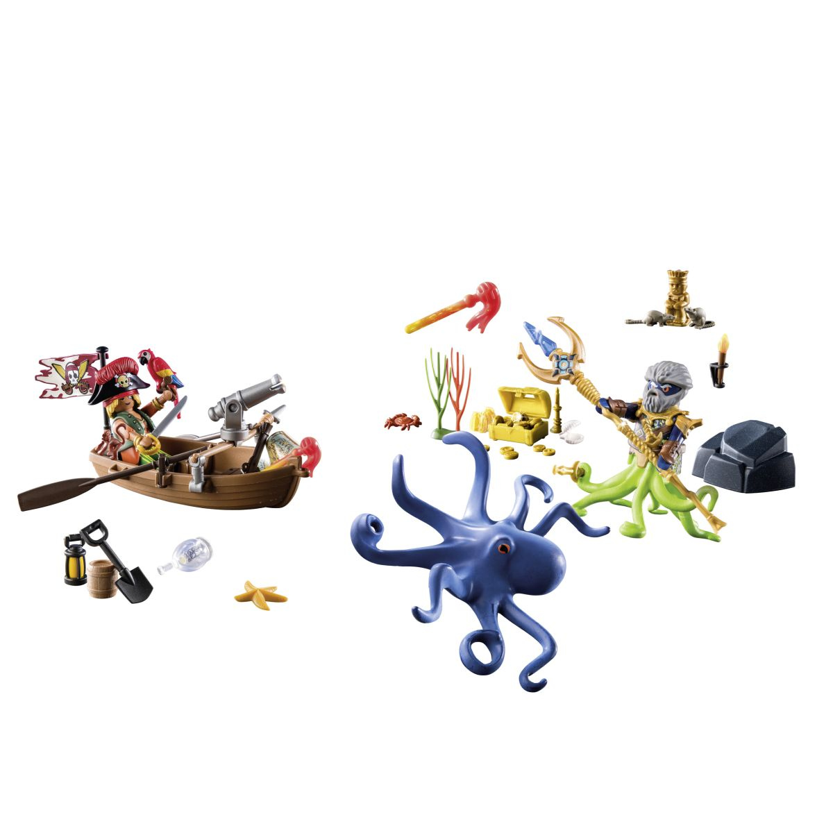 Inhalt: 1 Pirat, 1 Krakenmann, 1 Riesenkrake, 1 Papagei, 1 Klammeraffe, 1 Seestern, 1 Hummer, 2 Ratten, 1 Ruderboot, 2 Ruder, 1 Gewehr, 1 Kompass, 1 Flaschenpost, 1 Sitzstange für Papagei, 1 Stab mit Dolch, 1 Piratenhut mit Feder, 1 Kanone, 2 Geschosse, 1 Flagge mit Stange, 1 Schatzkarte, 1 Spaten, 2 Seegräser mit Bodenplatte, 2 Messer, 1 Dreizack, 1 Fackel mit Halterung, 2 Efeu, 1 Fels, 1 Kristall, 1 Trog, 1 Fass, 1 Laterne, 1 Kerzenständer, 1 Statue, 1 Grasbüschel, 1 Muscheldose, 1 Truhe mit Goldmünzen
