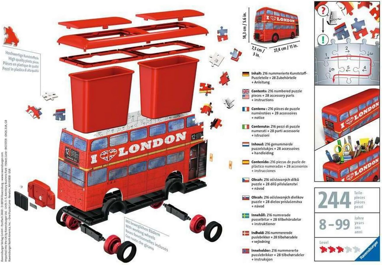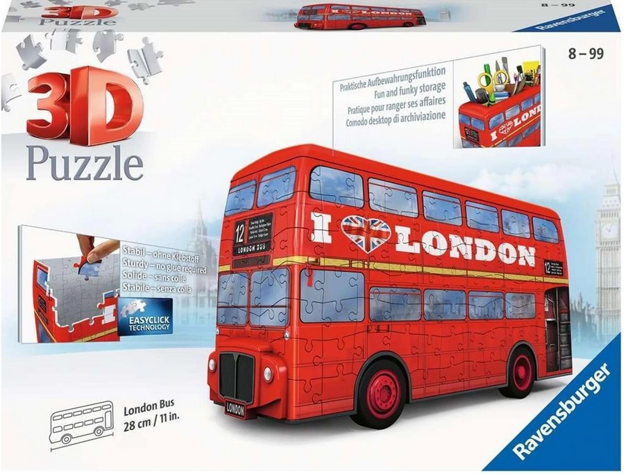 Er ist bekannt wie der sprichwörtliche bunte Hund und erfreut sich größter Beliebtheit: Der rote Doppeldeckerbus ist aus Londons Straßen nicht wegzudenken und jetzt endlich auch als 3D Puzzle Modell erhältlich. Die 216 individuell geformten Puzzleteile passen dank EasyClick Technology perfekt zusammen und formen ganz ohne Kleben ein stabiles dreidimensionales Abbild des legendären Busses. Damit ist der Puzzlespaß für London-Fans zwischen 8 und 99 Jahren vorprogrammiert – der mithilfe einer bebilderten Anleitung zur unbeschwerten Freude wird. Die 28 Zubehörteile inklusive drehbarer Räder sorgen auch nach dem Puzzeln für pures Vergnügen.